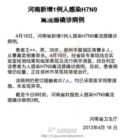 人民日报记者曲昌荣消息:4月18日,河南省新增1例人感染H7N9禽流感确诊病例。患者38岁,郑州市管城区南曹乡人,从事禽类销售宰杀。目前,患者病情仍较重。截至今日8时,河南共报告人感染H7N9禽流感确诊病例3例。目前,全国已通报84例人感染H7N9确诊病例。
